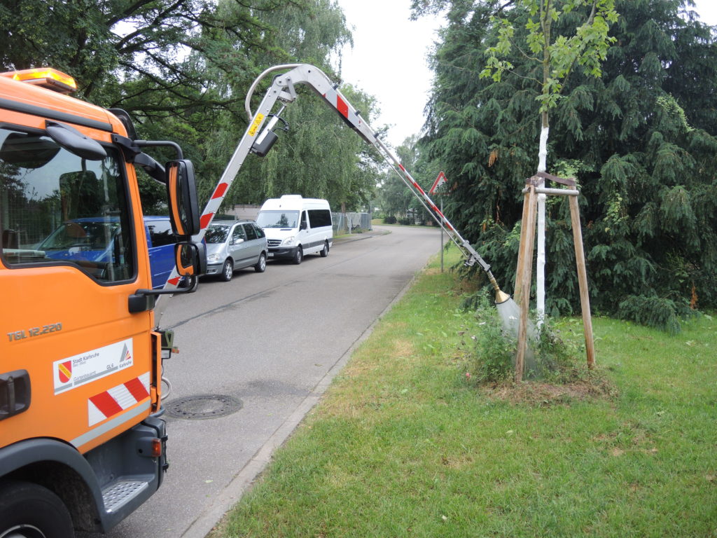 Bereits in den vergangenen Jahren, hat die Stadt technische Verbesserungen für die Baum-Bewässerung in der Fächerstadt veranlasst. So gibt es, unter anderem zwei Fahrzeuge mit einem, an der Front hydraulisch beweglichen Arm, einer sogenannten Teleskop-Lanze, welche das effizient wässern unterstützt und so rund 60 Bäume am Tag versorgen kann.