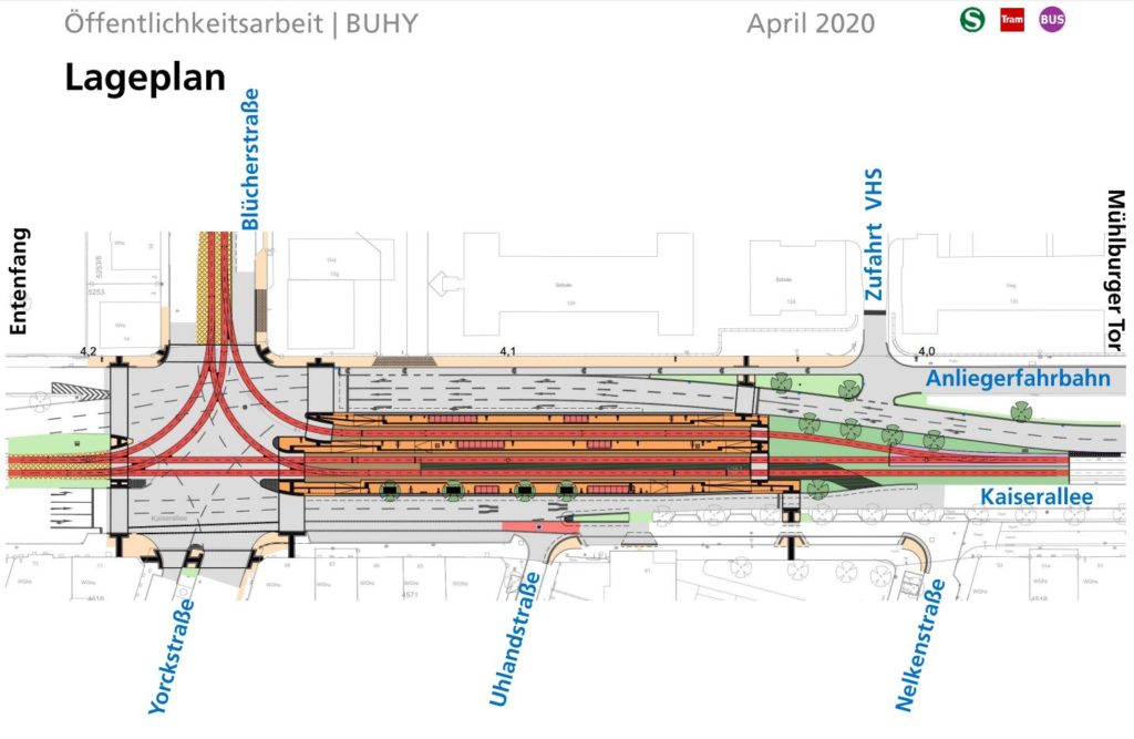 Der Straßenraum im Bereich der Haltestelle und dem Knotenpunkt Kaiserallee / Yorckstraße / Blücherstraße wird umgestaltet, Geh- und Radwege werden saniert. Auch der Asphalt der Kaiserallee wird erneuert – zunächst auf der Anliegerfahrbahn zwischen Kochstraße und Paul-Ehrlich-Straße. Später entsteht ein neuer Fahrbahnteiler zwischen der Hauptfahrbahn der Kaiserallee und der Anliegerfahrbahn. Auch der S-Bogen der Nördlichen Hildapromenade wird erneuert.