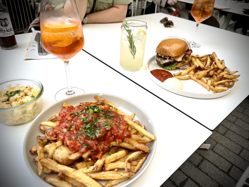 Sowohl der Innen- als auch der Außenbereich laden zum Verweilen ein. Auf der Speisekarte stehen an diesem Abend eine kleine Auswahl an Burger- und Fritten-Variationen. Die Getränkekarte lässt kaum Wünsche offen. Für Musik sorgt ein DJ.