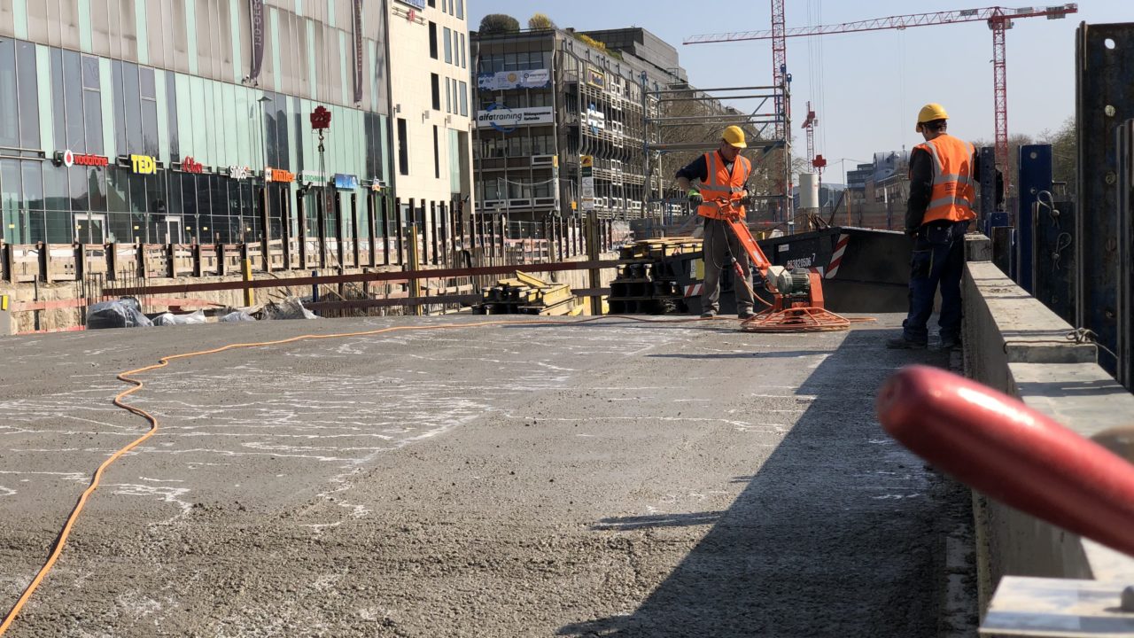 In Summe waren rund 60 Betonmischer nötig, um rund 1.000 Tonnen Beton in die Kriegsstraße zu bringen. Gleichzeitig wurden rund 150 Tonnen Bewehrung verbaut. Die jetzt hier verbaute Decke ist fast 400 Quadratmeter groß und ist bis zu 1,10 Meter dick.