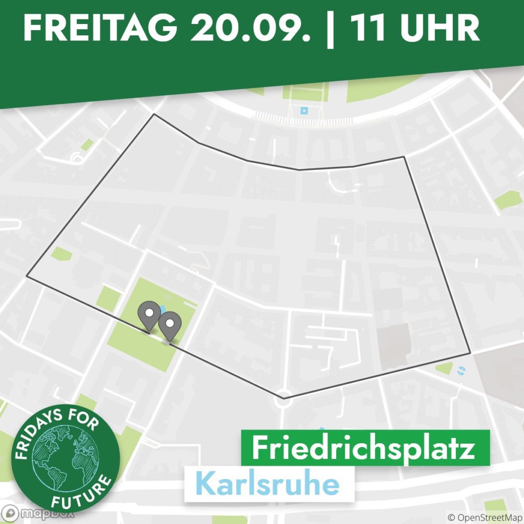 Der große Klimastreik in der Fächerstadt beginnt um 11:00 Uhr mit einer Kundgebung am Friedrichsplatz in der Innenstadt. Ab 11:45 Uhr startet der Demozug, welche mit einem allgemeinen Block beginnt und dem andere Blöcke mit Organisationen folgen. Fridays-For-Future informiert, dass Parteien ihre Blöcke an das Ende der Demonstration positionieren sollen. Nach der Demo wird die Band „Headphonemusic“ auf dem Friedrichsplatz für die Teilnehmer spielen. Übrigens: Zumindest ein Zeichen hat auch die Karlsruher Stadtpolitik gesetzt: So wurde im Sommer 2019 der Klimanotstand in Karlsruhe ausgerufen.