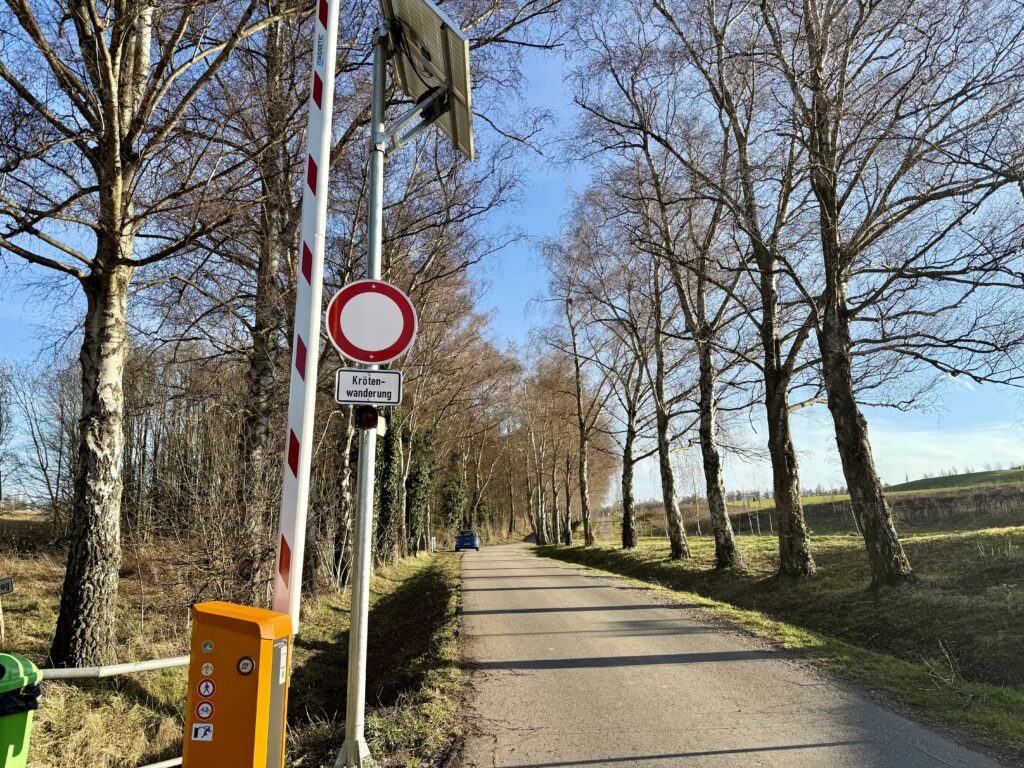 Auch im Batzenhofweg an der Zufahrt zum Golfplatz wandern die Amphibien – der Weg ist daher ab sofort und bis Ende Mai 2026 von 18:00 Uhr bis 06:00 Uhr mittels einer Schrankenanlage gesperrt.