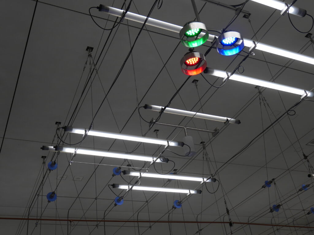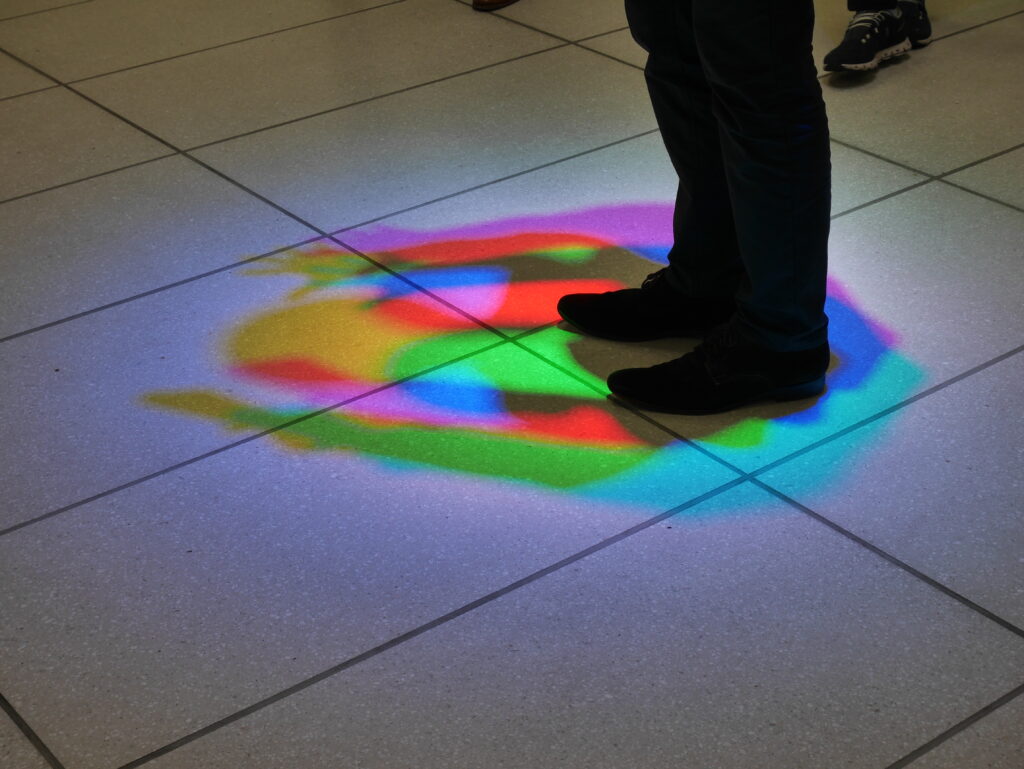 6. Die RGB-Spots in den Haltestellen sind eine Mischung der drei Primärfarben Rot, Grün und Blau. Die Mischung lässt auf dem Bahnsteig einen weißen Lichtkegel erscheinen, erst wenn Passanten in die Lichtstrahlen eintreten, entsteht ein bunter Schatten.