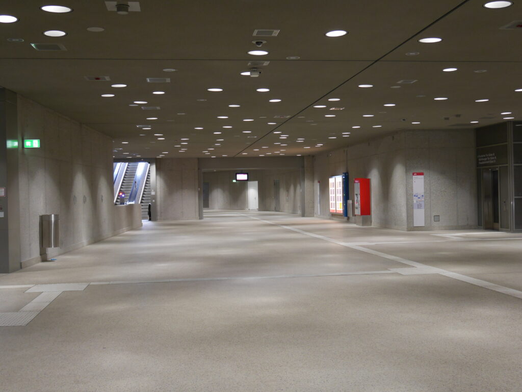 3. Der Bodenbelag in den Haltestellen besteht aus hellem Terrazzo und soll optisch das Konzept des „veredelten Rohbaus“ weiterführen.