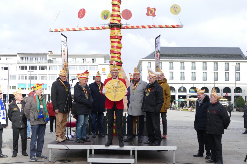 Bereits zum zweiten Mal wurde der ehemalige Weihnachtsbaum entastet und mit den Wappen der Karlsruher Fastnachtsvereine geschmückt. Der Narrenbaum wird bis zum Aschermittwoch auf dem Marktplatz stehen.