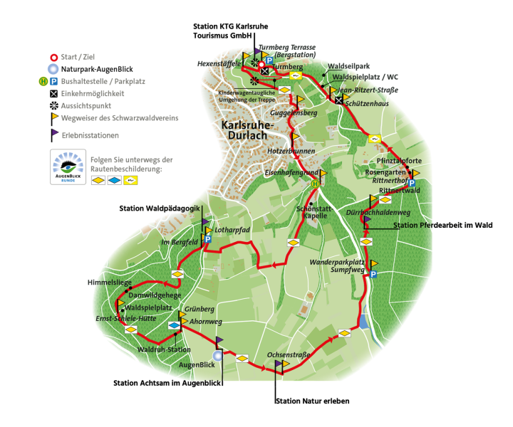 Der neue 10 Kilometer lange Rundweg kann am Turmberg oder an alternativen Punkten gestartet werden. Beginnend an Durlachs Hausberg führt er über die Rittnertstraße ins offene Feld. Im Wald treffen Wandernde auf den Waldlehrpfad „WaldWelt“. Kinder können sich auf dem Waldspielplatz austoben.