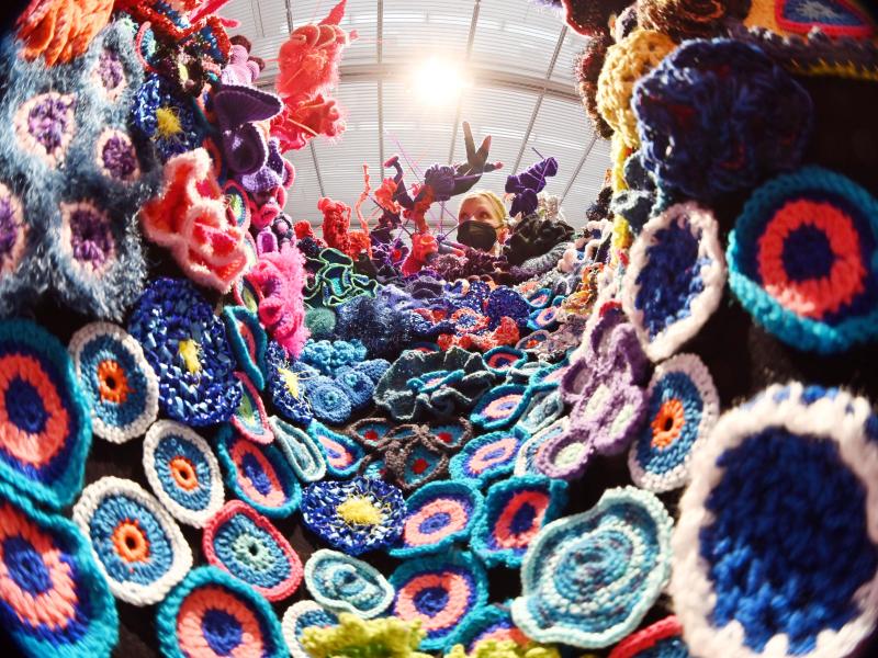 Viele Besucherinnen und Besucher haben an dieser Ausstellung selbst mitgewirkt: Mit gehäkelten Korallen wollten das Museum Frieder Burda und die Künstlerschwestern Wertheim auf die Zerstörung der Korallenriffe aufmerksam machen. Das kam offenbar gut an.