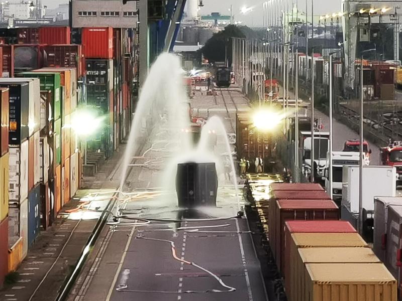 Auch nach mehr als einem Tag war der Einsatz der Kräfte von Polizei und Feuerwehr am Mittwochnachmittag noch nicht beendet. Es gehe darum, den Container zu kühlen, um die Reaktionen in ihm beherrschbar zu machen. Dieser Zustand werde bei Temperaturen von unter 50 Grad erreicht.