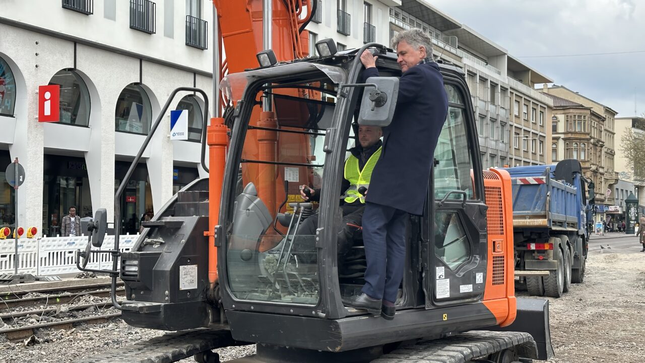 Am Dienstagnachmittag, 18. April 2023, fiel der Startschuss für die Bauarbeiten zur Neugestaltung der Karlsruher Kaiserstraße, mit einem symbolischen „Baggerbiss“. „Die Kaiserstraße wird fit gemacht für die Zukunft“, sagte Oberbürgermeister Dr. Frank Mentrup.