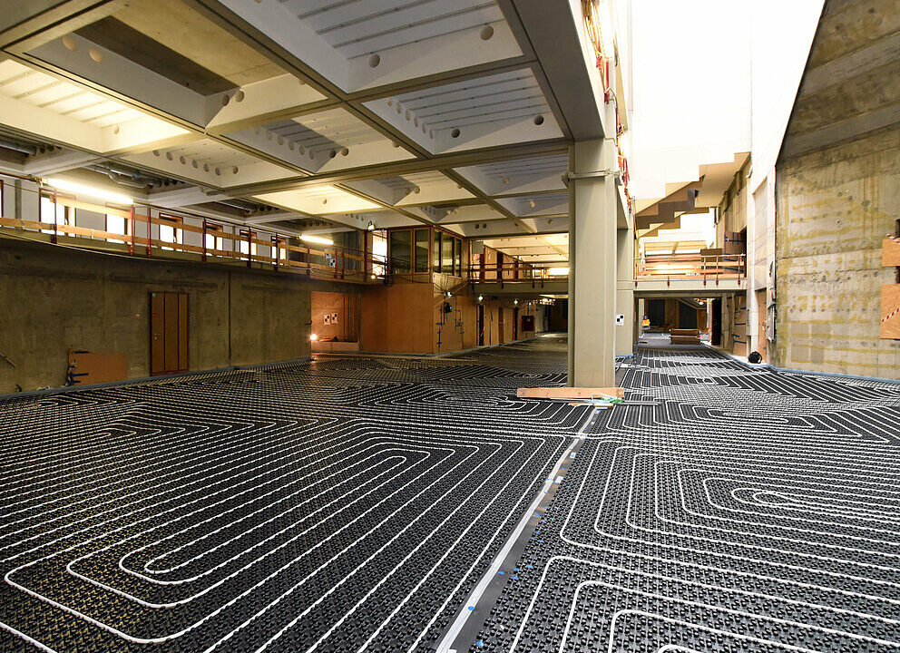 Nach Herstellung der für die neue Technikplanung erforderlichen Durchbrüche, Schachtöffnungen und Rückbauarbeiten von Lüftungskanälen mit schadstoffbelasteter, technischer Isolierung in den Kubusschächten könne ab März 2023, mit der Rohmontage der Sanitär-, Heizungs- und Elektrogewerke in den Technikzentralen und im Ringfoyer im Untergeschoss begonnen werden.