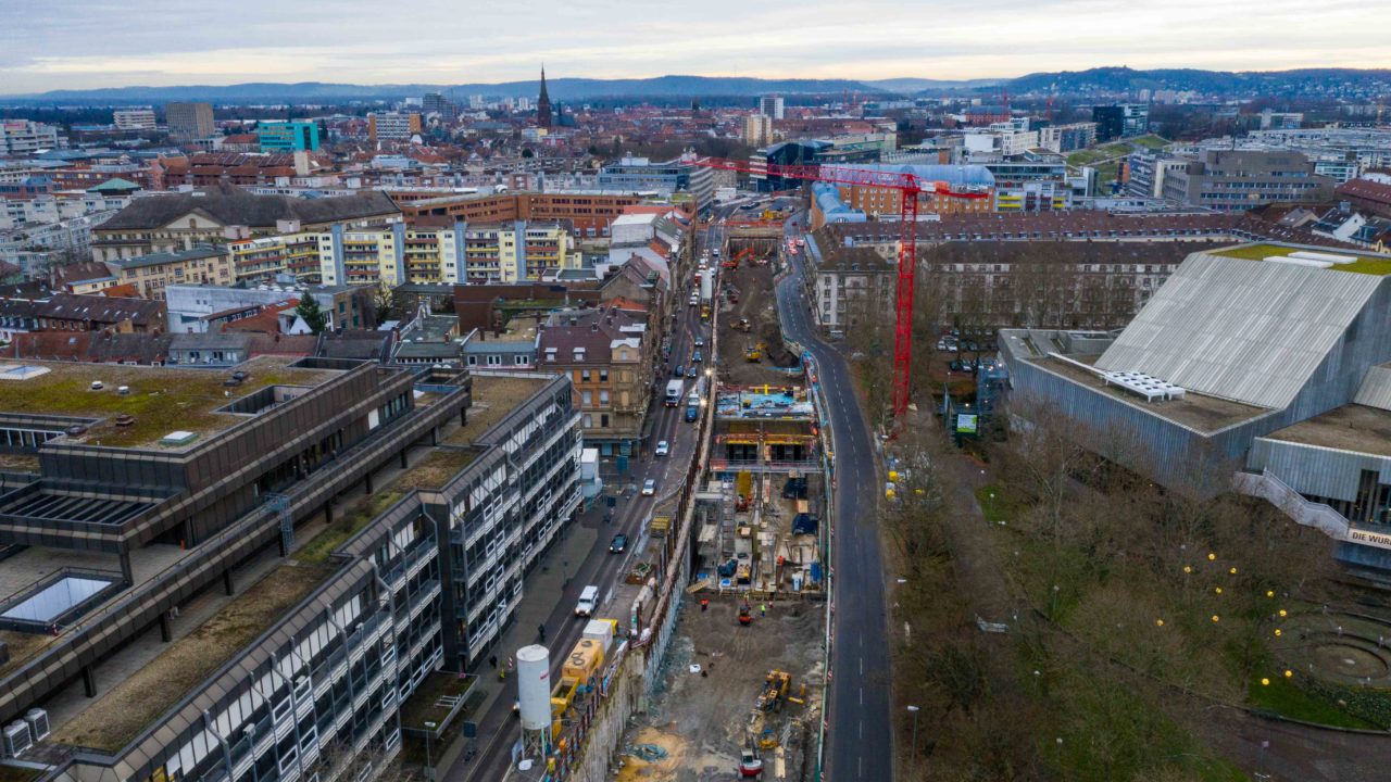 Ungeachtet der aktuellen Schwierigkeiten gingen die Arbeiten dem Bericht zufolge im vergangenen Jahr gut voran. So heißt es beispielsweise im Bezug auf das Teilprojekt Stadtbahntunnel: „Nachdem der Rohbau des Stadtbahn- und Straßenbahntunnels bereits 2018 abgeschlossen wurde, standen in 2019 noch Restarbeiten an, die insbesondere Arbeiten an der Oberfläche betrafen, die durch die Rohbauarbeiten entweder in Anspruch genommen worden waren oder an die unterirdische Verkehrsanlage angepasst werden mussten.“ Fortschritte gibt es auch in der Kriegsstraße zu berichten: Hier liegt der Fokus aktuell wie auch 2019 auf den Vorbereitungen für die Baugruben, aber auch auf dem Rohbau des Tunnels selbst.