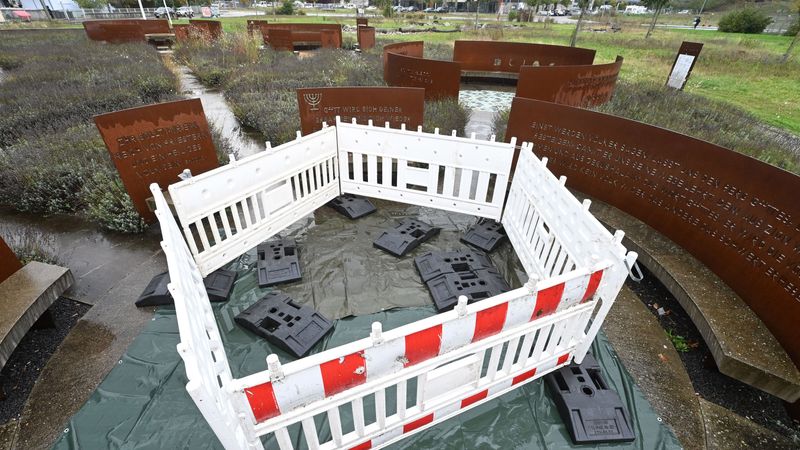 Im „Garten der Religionen“ in Karlsruhe ist eine Absperrung aufgestellt. Hinter dieser befindet sich ein beschädigtes jüdisches Mosaik, das mit Planen abgedeckt ist. | Quelle: Uli Deck/dpa