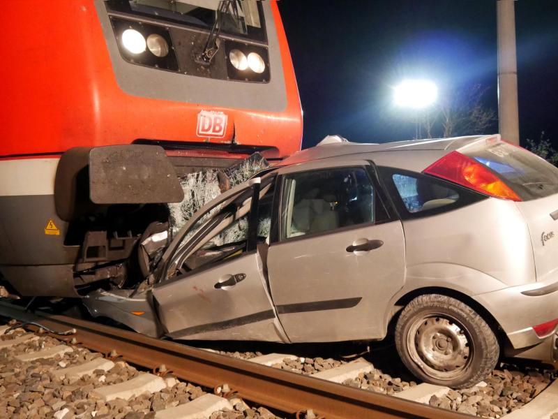 Der 37 Jahre alte Autofahrer war mit seinem Wagen auf den Gleisen steckengeblieben, konnte aber noch rechtzeitig aussteigen und alarmierte die Einsatzkräfte, wie die Polizei mitteilte. Kurz darauf raste ein Regionalzug in das Fahrzeug und schob das Auto mehr als 100 Meter vor sich her. Die rund 150 Fahrgäste des Zuges und das Personal blieben demnach unverletzt. Der Mann kam mit leichten Verletzungen davon. Laut einem Alkoholtest hatte der 37-Jährige mehr als 1,5 Promille intus.