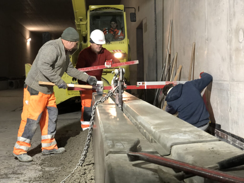 Unten im Karoline-Luise-Tunnel setzen sich die seit mehr als einem halben Jahr laufenden Arbeiten fort: Der Tunnel erhält seinen Innenausbau mit Leerrohren für elektrische Leitungen, mit Notgehwegen, mit Abwasserkanälen für das über die Rampen oder einfahrende Autos eindringende Regenwasser, mit einer Asphaltfahrbahn und schließlich auch mit allen für den sicheren Betrieb notwendigen technischen Einrichtungen und Ausstattungen.
