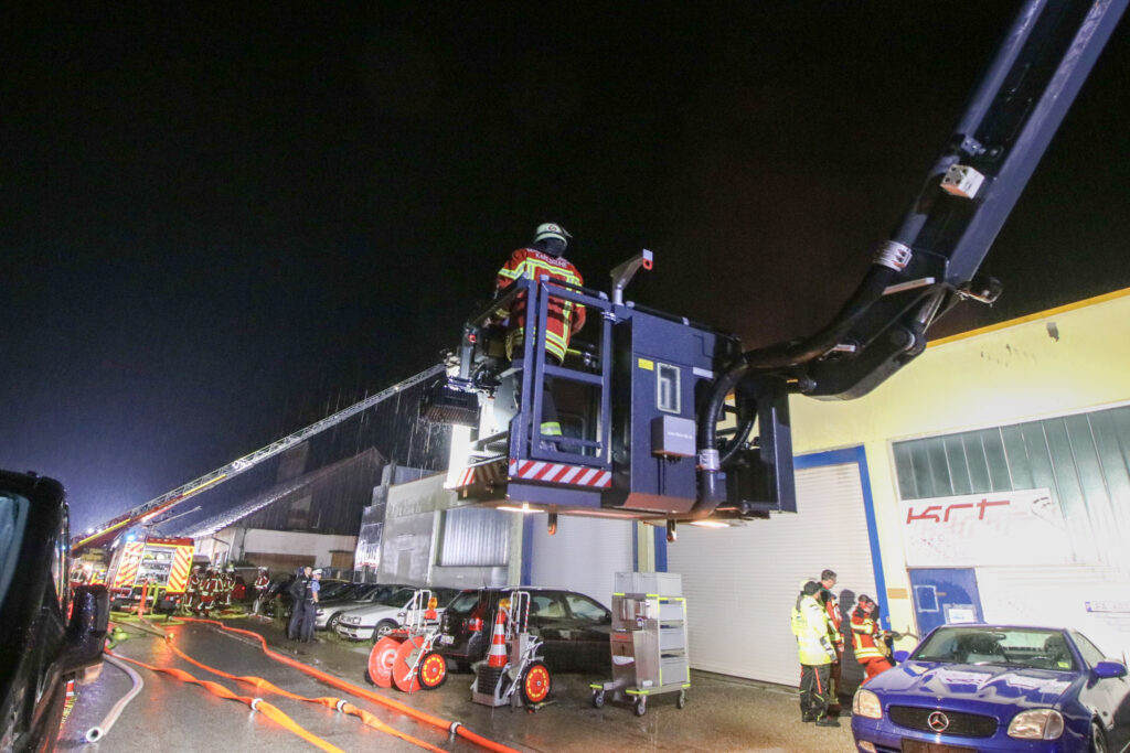 Infolge eines Blitzeinschlages geriet in der Nacht zum Samstag kurz nach Mitternacht in der Höhenfeldstraße in Weingarten ein Lager- und Werkstatthallenkomplex in Brand. Zeugen hatten dies wohl beobachtet und gegen 00:15 Uhr der Rettungsleitstelle gemeldet.