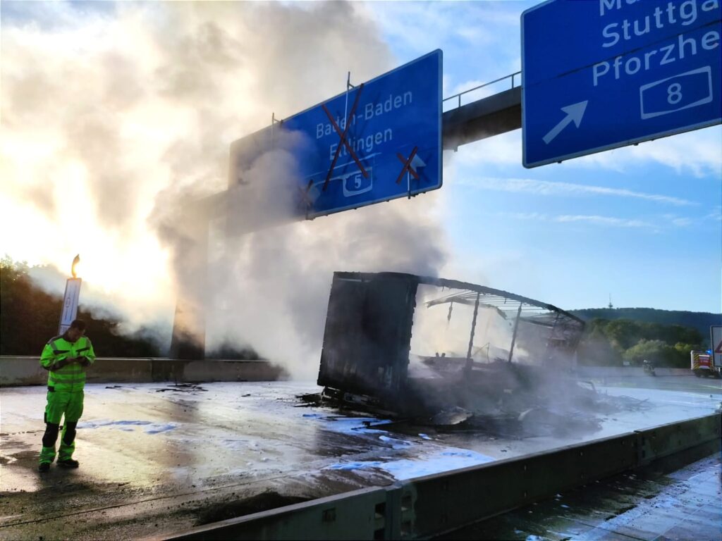 Der 52-jährige Lasterfahrer fuhr zunächst nahe der Baustelle am Autobahndreieck Karlsruhe gegen einen Fahrbahnteiler. Zunächst hieß es, das Fahrzeug sei gegen eine Leitplanke gefahren. Der Laster fing anschließend Feuer. Verletzt wurde niemand. Die Unfallursache war vorerst unklar. Die A8 war in Fahrtrichtung Karlsruhe gesperrt, die A5 kurzzeitig in beide Richtungen. Den Angaben nach bildeten sich dadurch lange Staus.