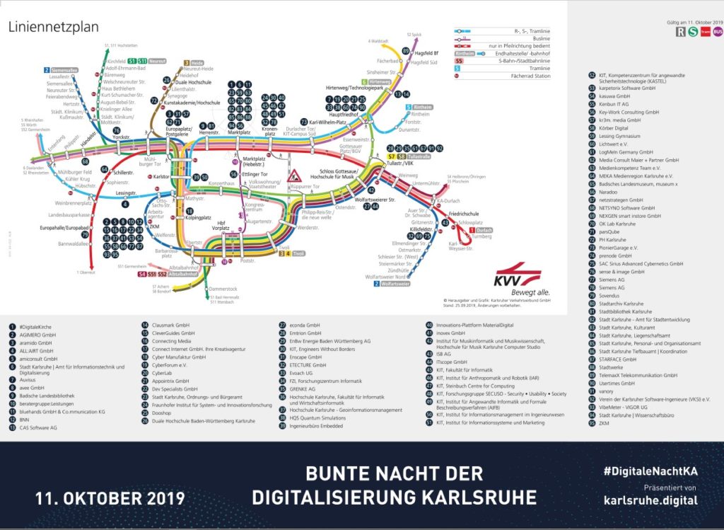 Eine Auswahl an Stationen bei der Bunten Nacht der Digitalisierung in Karlsruhe. Zu finden sind an den genannten Orten mehrere Unternehmen und Organisationen, die sich präsentieren.