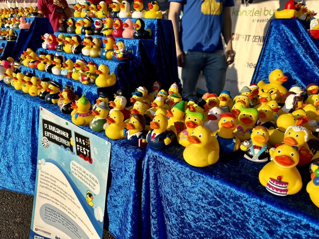 Fest verankert im DAS-FEST-Programm ist das Entenrennen, das am Sonntag, 23. Juli 2023, im Anschluss an den Klassik-Vormittag startet. Alle Jahre wieder schwimmen die Gummienten für eine soziale Einrichtung im Raum Karlsruhe, die sich um das Wohl von Kindern und Jugendlichen kümmert.