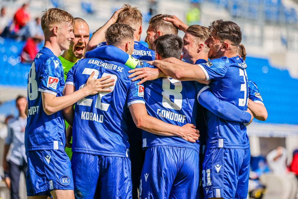 Die Mannschaft jubelt mit Philipp Hofmann (KSC 33) zum 2:1 Führungstreffer. | Quelle: Tim Carmele | TMC-Fotografie.de