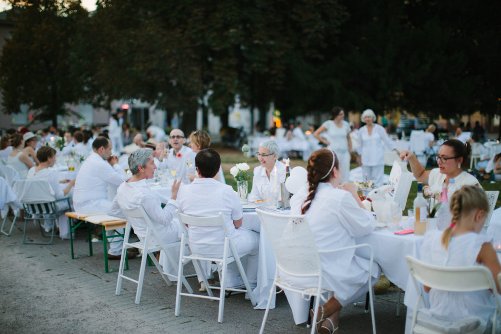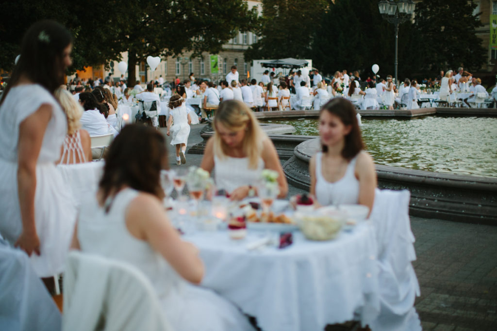 Anfang September kann es passieren, dass man bei einem Spaziergang durch Karlsruhe plötzlich eine Versammlung weiß gekleideter Menschen an weißen Tafeln im Freien sitzend, bei musikalischer Untermalung speisend, erblickt. Denn seit 2013 findet jedes Jahr in Karlsruhe, am ersten Samstag im September, eine besondere Art des gemeinschaftlichen Dinierens statt: Das Dîner en blanc.