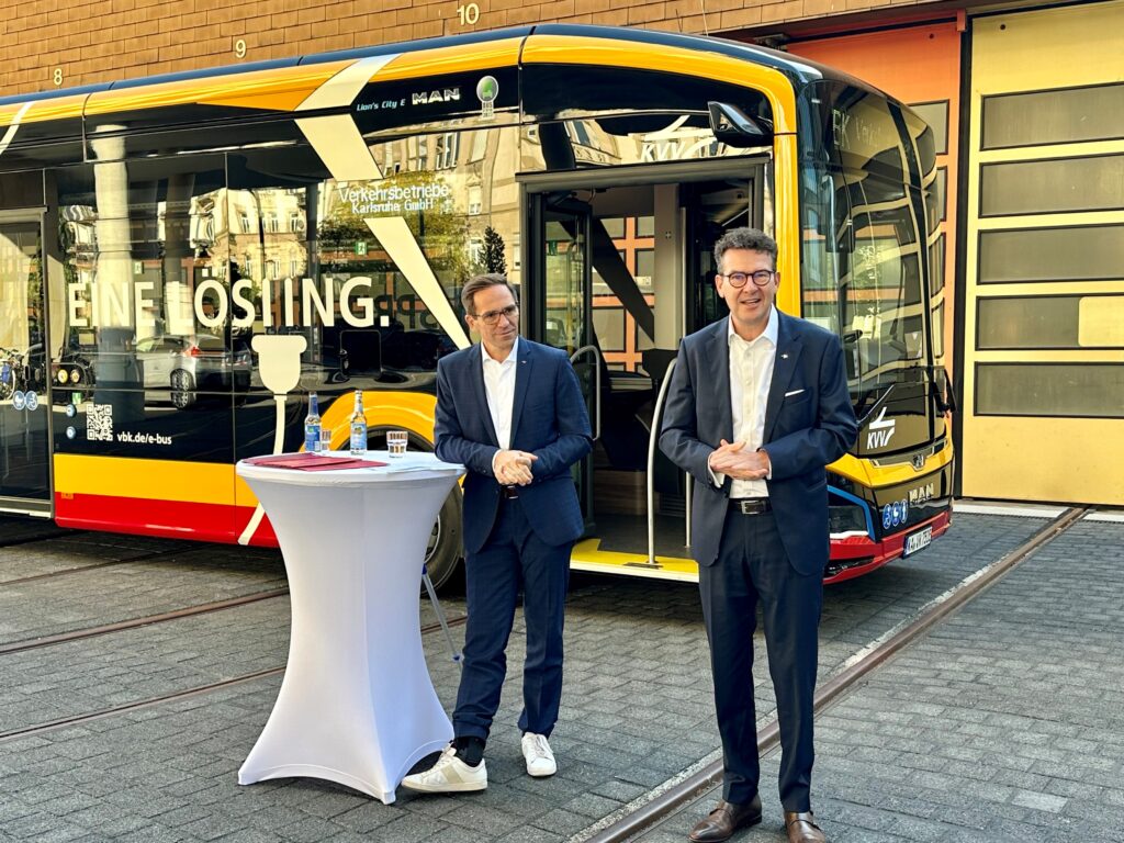 Ab dem Fahrplanwechsel im Dezember 2023 sollen im Karlsruher Stadtgebiet erstmals klimafreundliche Elektrobusse einsetzt werden. Über die Vorzüge des neuen Elektrobusses sowie das Ladeinfrastruktur-Konzept und den künftigen Einsatz der Busse im Stadtgebiet wurde am 11. Oktober 2023, bei einem Pressetermin informiert.