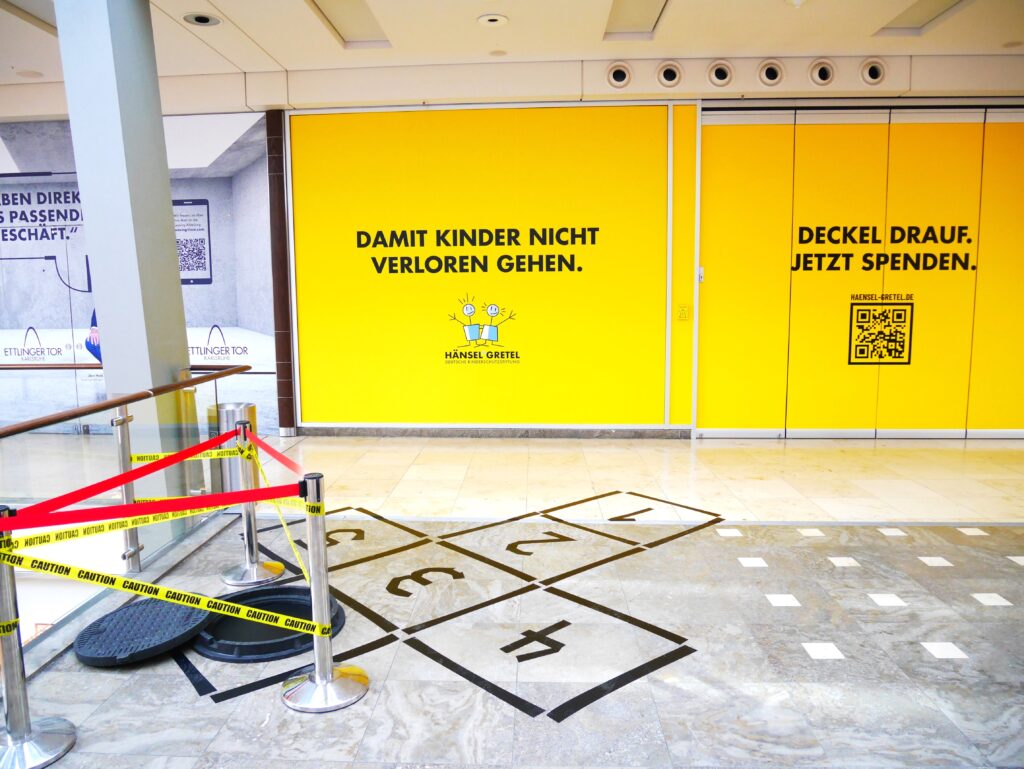 Die Deutsche Kinderschutzstiftung Hänsel+Gretel startete am Mittwoch, 22. Februar 2023, eine Aktion im ETTLINGER TOR Center Karlsruhe. Hier soll ab sofort eine 40 Quadratmeter große Schaufensterfläche auf den Kinderschutz aufmerksam machen.