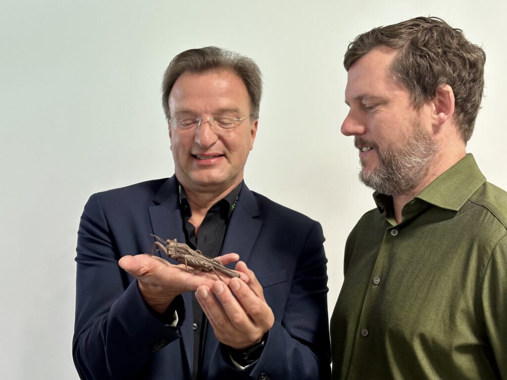 Dr. Matthias Reinschmidt und Prof. Dr. Martin Husemann mit einem vergrößterten 3D-Modell der Heuschrecke. | Quelle: Melanie Hofheinz