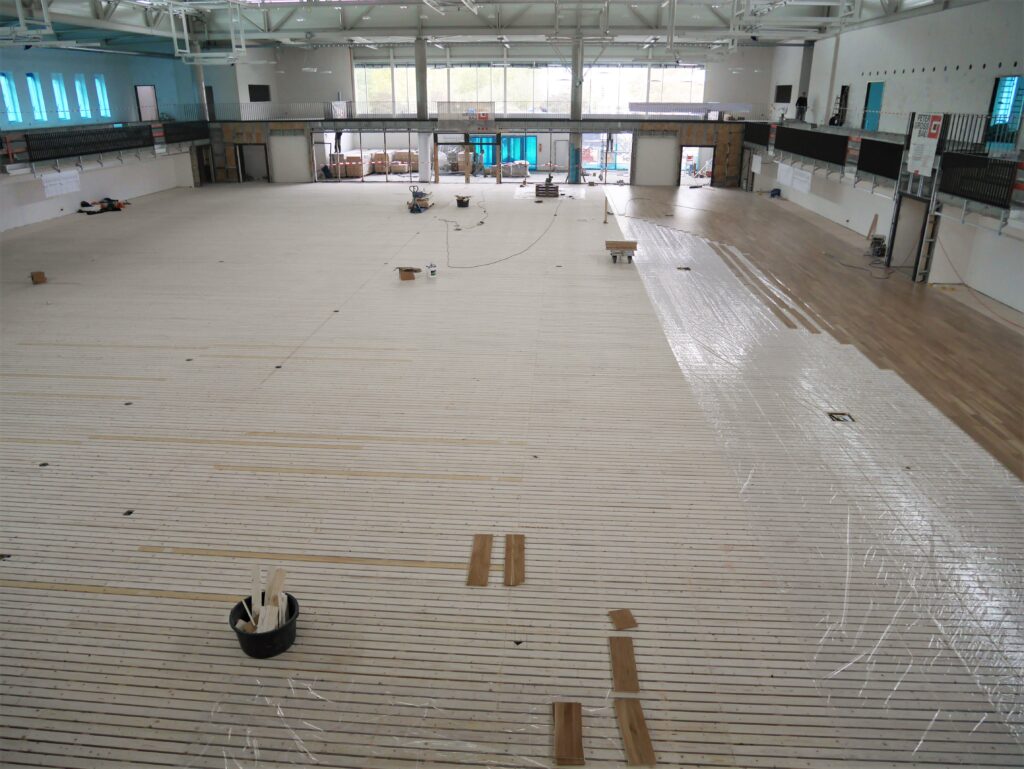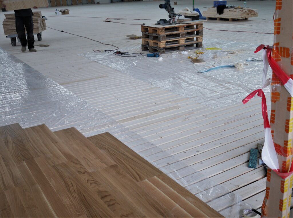 Bis zur Eröffnung der Halle im Mai 2021 stehen nun insbesondere Arbeiten im Technikbereich an – aber auch die Tribünen, Oberflächen und Fußböden stehen noch auf dem Programm. Derzeit wird unter anderem der Sportboden aus Kork verlegt. Hier folgen dann noch die Markierungen, um aus der Fläche einen „richtigen Sportboden“ zu machen. Um die Halle im Mai einsatzbereit zu haben, dürfen außerdem die Sportgeräte nicht fehlen.