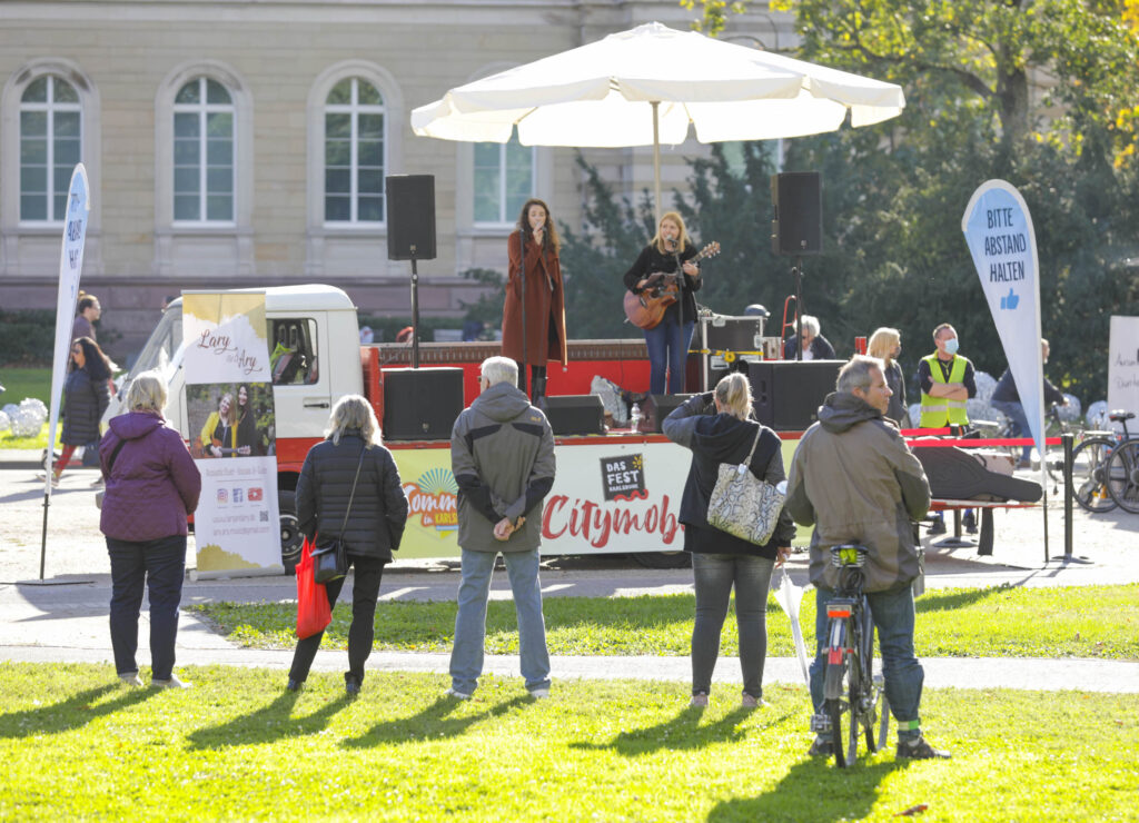 Viele dezentrale Attraktionen lockten die Karlsruher zu der Eröffnung des neugestalteten Marktplatzes in die Innenstadt. Denn die Fächerstadt feierte die Fertigstellung des zentralen Stadtplatzes am Samstag, den 10. Oktober 2020, mit einem Corona-gerechten und dezentralen Rahmenprogramm.
