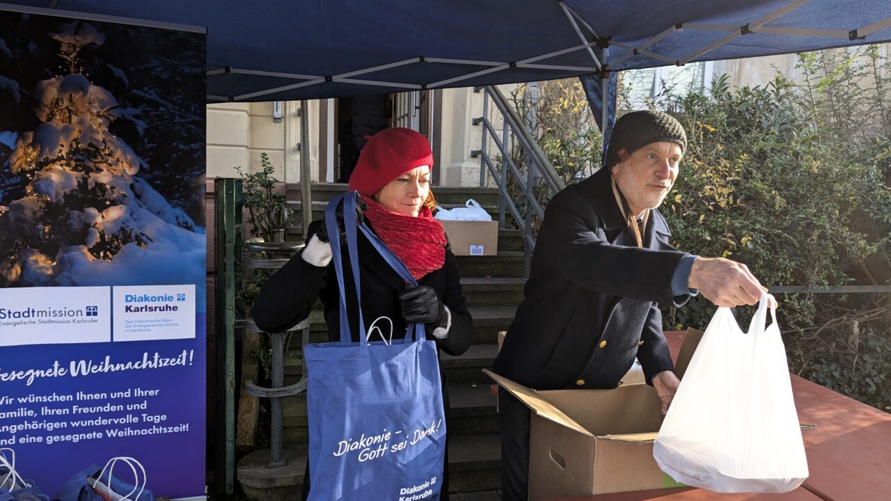 Unter dem Motto: „Niemand muss hungrig sein“ veranstalteten die Evangelische Stadtmission Karlsruhe und das Diakonische Werk Karlsruhe ihre traditionelle Weihnachtsaktion: Wohnungslose, ältere und arme Menschen erhielten am 24. Dezember 2024, vor dem A³ (Alkoholakzeptierender Aufenthaltsraum) in der Ettlinger Straße in Karlsruhe ein warmes Mittagessen sowie eine Weihnachtsgeschenktüte.