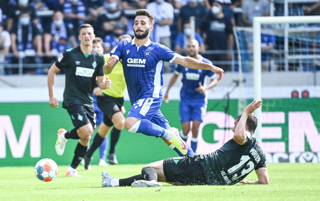 Zweikampf, Duell Fabian Schleusener (KSC) gegen Milos Veljkovic (Werder), der daraufhin die gelbet Karte sah. | Quelle: GES/Markus Gilliar
