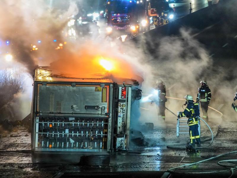 Nach dem Unfall geriet der Sattelzug in Brand und musste von der Feuerwehr gelöscht werden. Es entstand ein Sachschaden im sechsstelligen Bereich.
