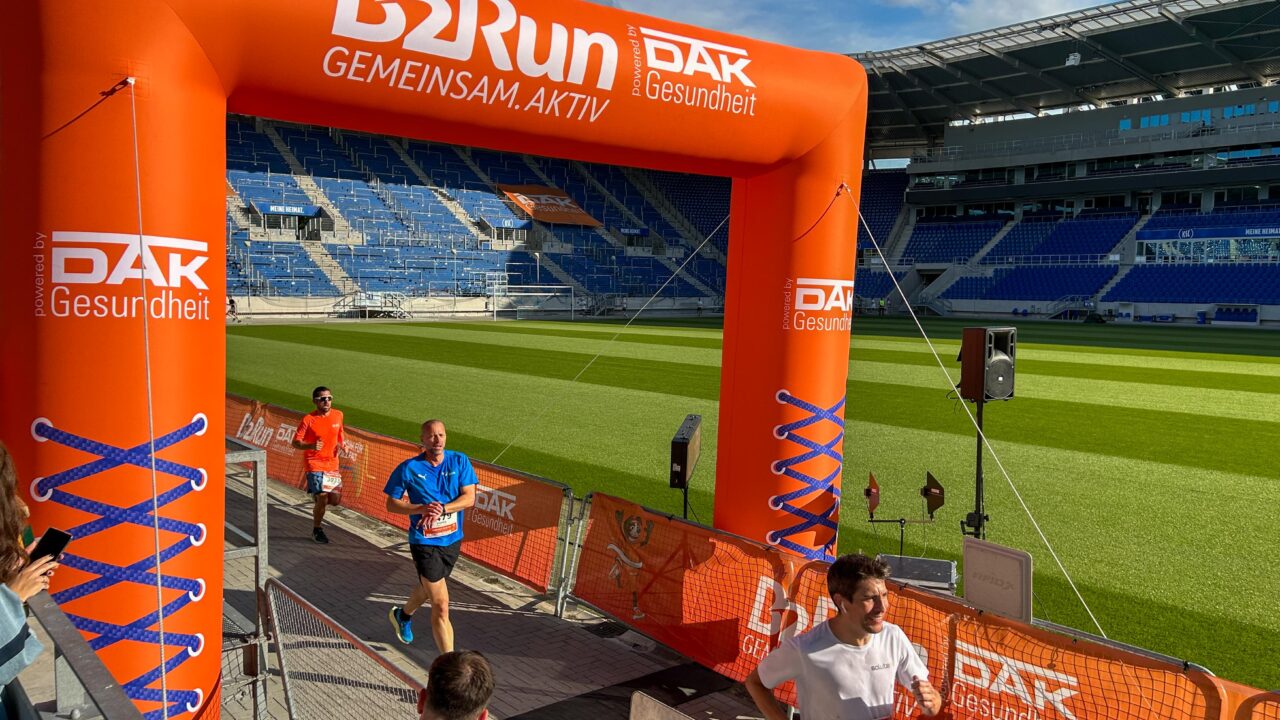 9.700 Teilnehmende aus 450 Firmen haben sich beim B2Run 2024 in Karlsruhe angemeldet – neuer Rekord! Der Zieleinlauf war im neuen Stadion.