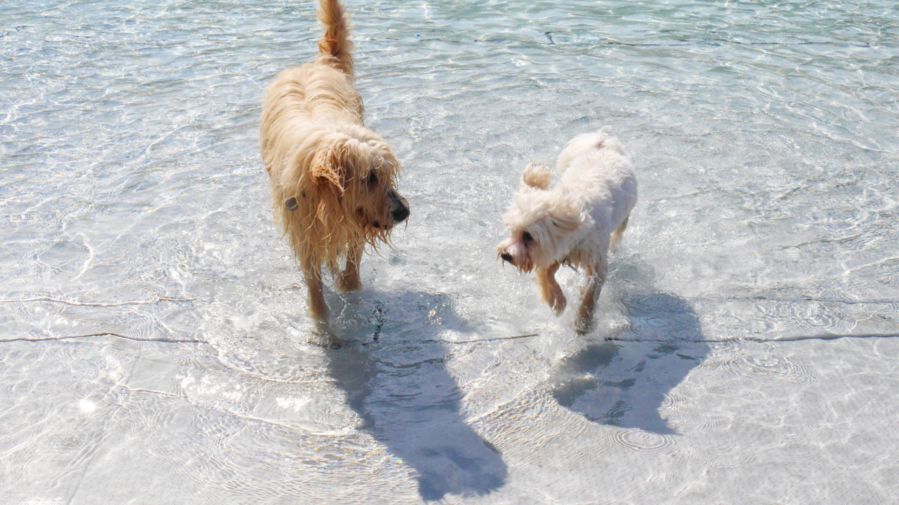 Hundeschwimmen in Karlsruhe! Immer bevor das Wasser im Rheinstrandbad Rappenwört für die Wintersaison ausgelassen wird, dürfen die Hunde darin planschen.