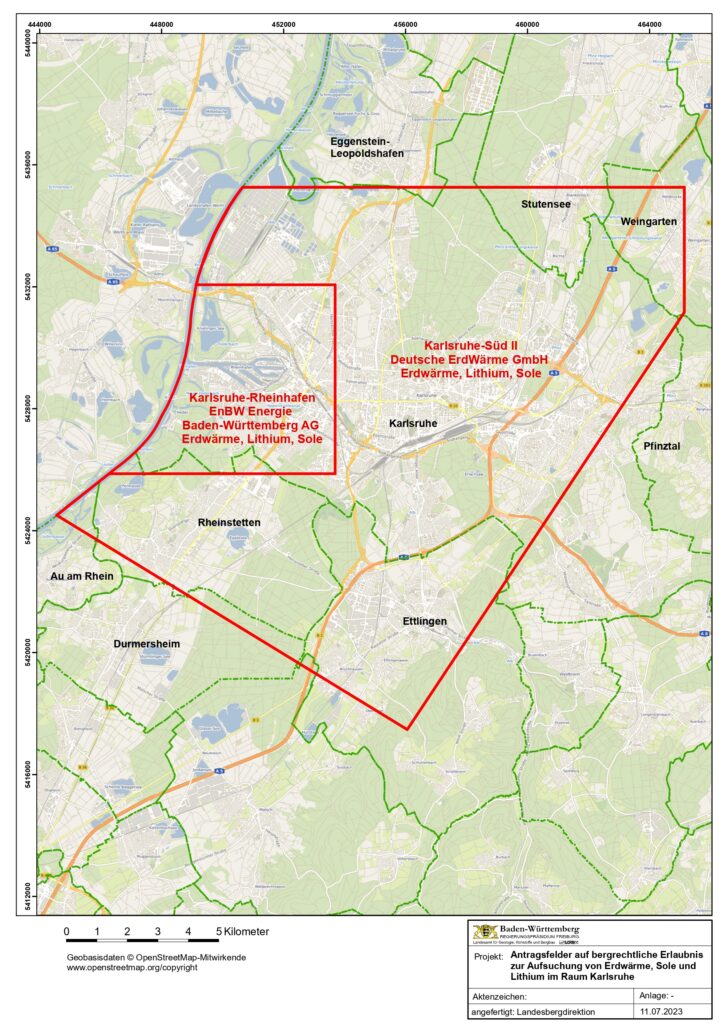 Das Landesamt für Geologie, Rohstoffe und Bergbau (LGRB) im Regierungspräsidium Freiburg (RP) hat zwei Aufsuchungserlaubnisse für Erdwärme, Sole und Lithium im Raum Karlsruhe verliehen, das geht aus einer Meldung des Regierungspräsidiums Karlsruhe hervor.