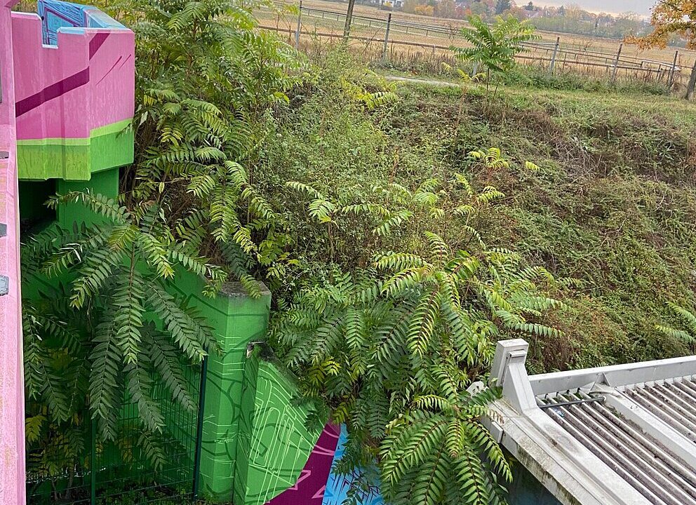 Eine invasive Ausbreitung des Götterbaums sei, laut Angaben der Stadt Karlsruhe, in der ganzen Fächerstadt zu beobachten. An der Böschung im Bereich um die Haltestelle August-Bebel-Straße müssen die Bäume nun gefällt werden, wird angekündigt.