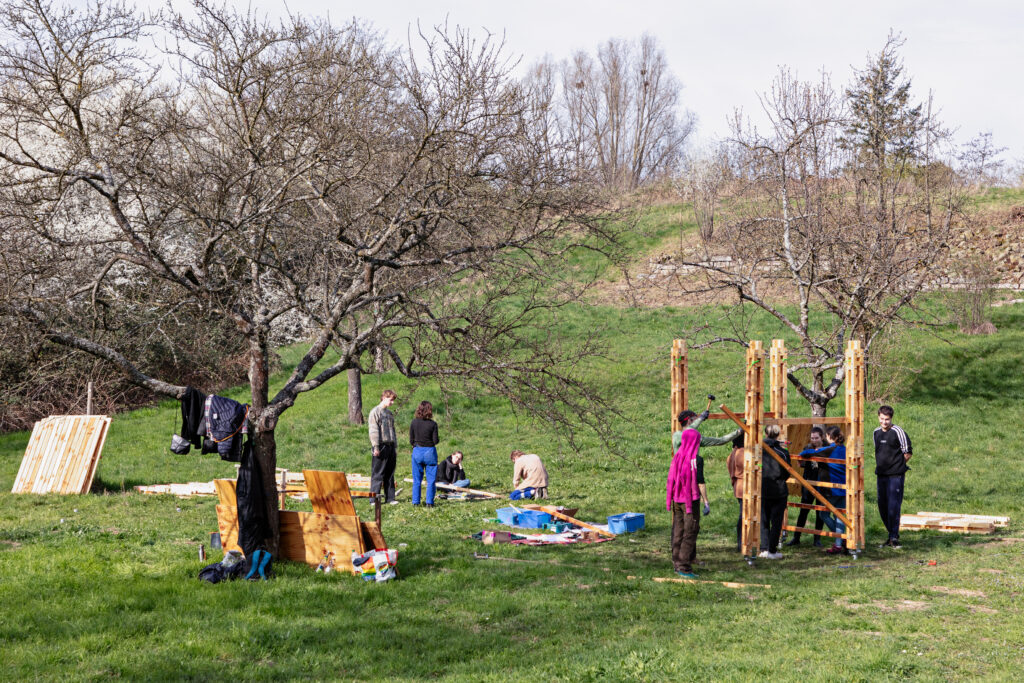 Die Umsetzung erfolgte in enger Zusammenarbeit mit den Lehrstühlen für Bildende Kunst, Konstuktion und Entwerfen sowie Tragwerksplanung am KIT. Da auf die Verwendung von Primärrohstoffen weitestgehend verzichtet werden sollte, wurde für den Bau recyceltes Altholz verwendet, das zum Teil von Anwohner/-innen der Wiese gespendet wurde.