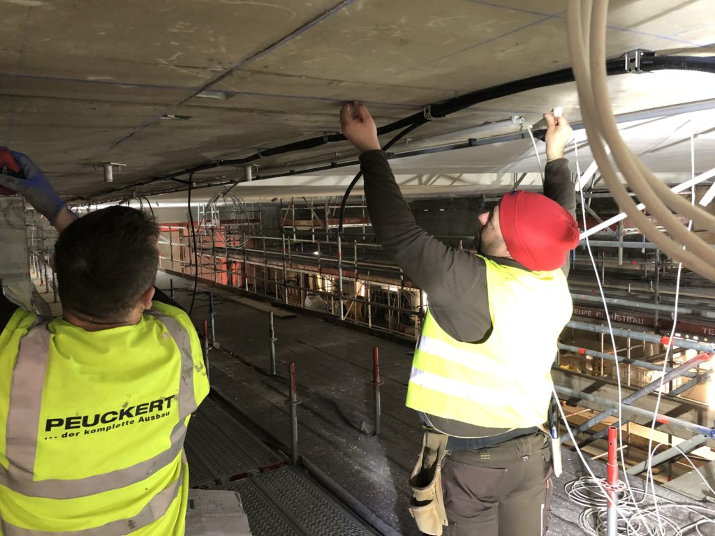Der Innenausbau des Stadtbahn- und Straßenbahntunnels unter der Kaiserstraße zwischen Gottesauer Platz und Mühlburger Tor mit dem Südabzweig vom Marktplatz in die Ettlinger Straße beschäftigt aktuell viele der Handwerker: Elektriker, Installateure, Maurer und Trockenbauer oder Gleisbauer tummeln sich hier. Besonders gefragt sind derzeit einerseits die Elektriker, andererseits aber auch die Trockenbauer, die für das Erscheinungsbild der sieben neuen Haltestellen sorgen: Nach den Plänen der Architekten verkleiden sie die Haltestellen mit fast weißen Betonwerksteinen, setzen leichtere Verkleidungsplatten an die oberen Haltestellen-Wandbereiche oder eben auch unter die Decke.