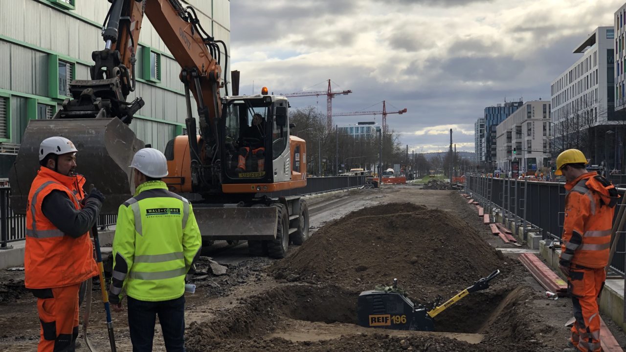 Im Westen, im Baufeld W 1 zwischen Ritterstraße und Karlstor, ist das Herstellen des Tunnels auch als Aufgabe für die Arbeiter angekommen. Zudem werden aber im Bereich Karlstor und direkt westlich daran anschließend noch die den Tunnelbau vorbereitenden Arbeiten absolviert. Einerseits wird in dem Bereich, in dem bereits der Bau-grubenverbau hergestellt ist, der Erdaushub und das Verankern der Baugrubenwände auf der zweiten, der untersten Ebene vorangetrieben. Andererseits steht in den nächsten Wochen das Herstellen des Baugrubenverbaus an.