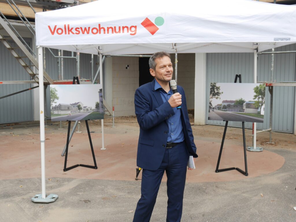 Im Beisein von Baubürgermeister Daniel Fluhrer und Volkswohnungs-Geschäftsführer Stefan Storz wurde am Dienstag, 11. Oktober 2022, ein Richtfest für das ungewöhnliche Projekt gefeiert.