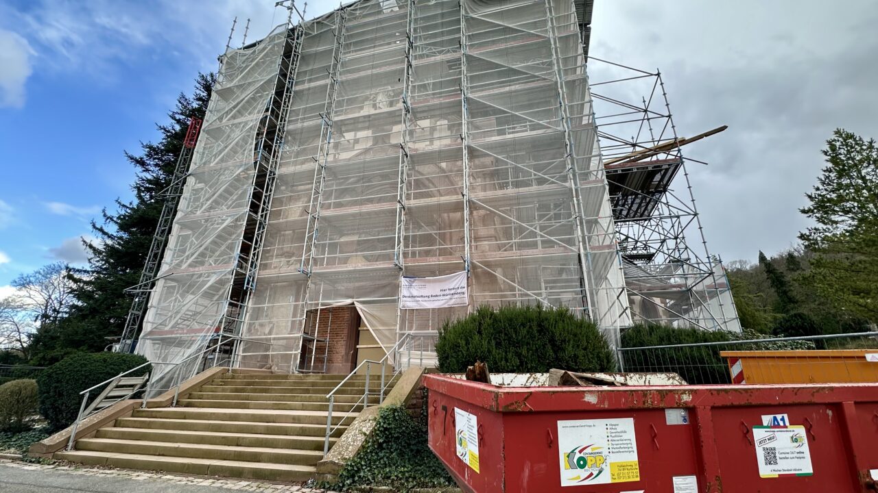 Die Kapelle am Bergfriedhof in Durlach ist ein Gerüst gehüllt – und kaum zu erkennen. Hier laufen allerhand Arbeiten, um das Gebäude weiterhin zu erhalten. Denn der Zustand des Denkmals war kritisch.