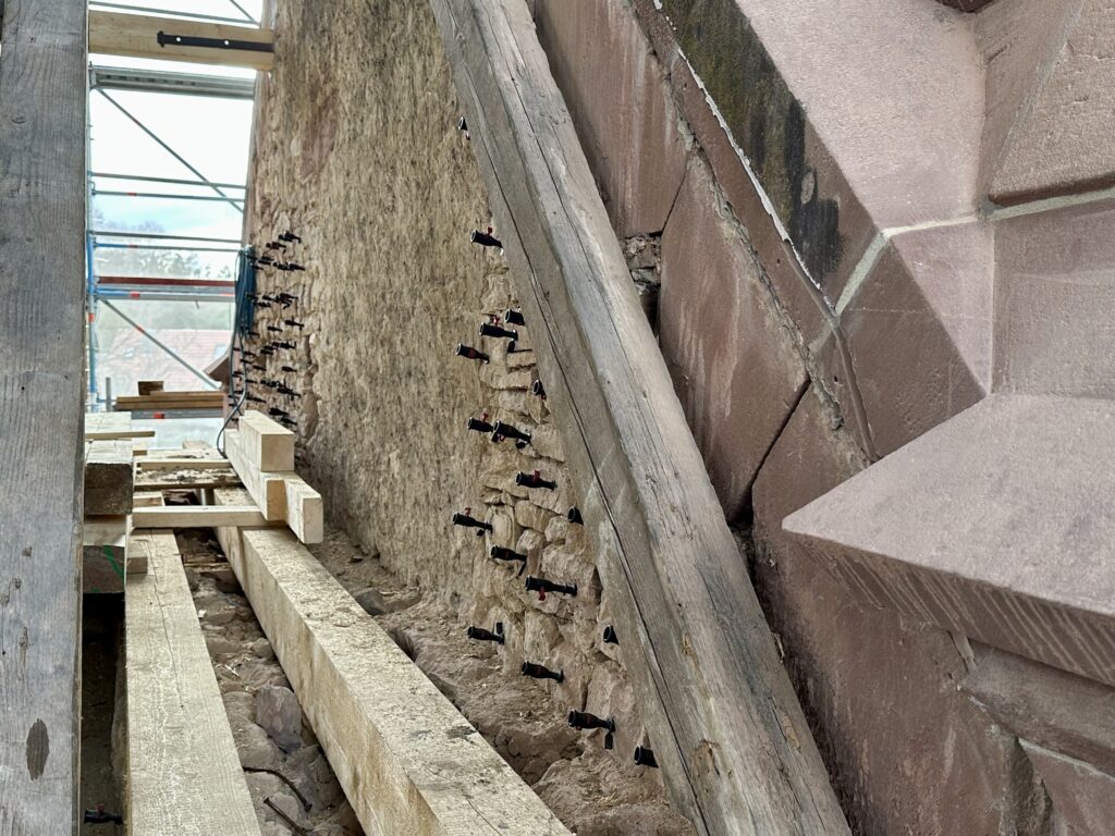 Mittlerweile wurden über 2.000 Injektionen gesetzt, um den Schwamm aus dem Mauerwerk zu vernichten. Außerdem musste das komplette Dach der Kapelle abgenommen werden.