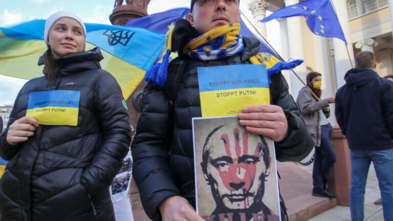 "Solidarität mit der Ukraine!":' Mahnwache auf dem Marktplatz in Karlsruhe
