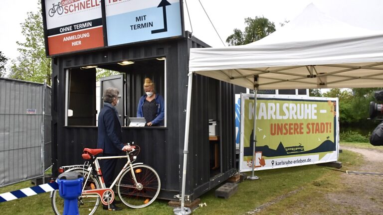 Seit Dienstag, 11. Mai 2021, gibt es eine Schnelltest-Station für Radfahrer in der Günther-Klotz-Anlage in Karlsruhe. Eine Terminvereinbarung für den kostenlosen Test ist per App oder online möglich. Das Testergebnis wird danach per E-Mail zugeschickt.