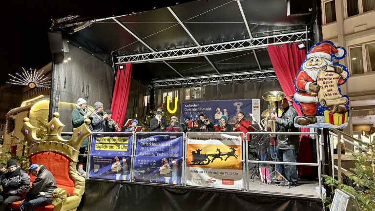 Wie in der Vergangenheit sollte während des Christkindlesmarktes der Karlsruher Marktplatz durch ein Bühnenprogramm ehrenamtlicher Musikerinnen und Musiker zum Verweilen einladen. Allerdings kann es 2024, außer am Eröffnungstag, kein Bühnenprogramm geben.