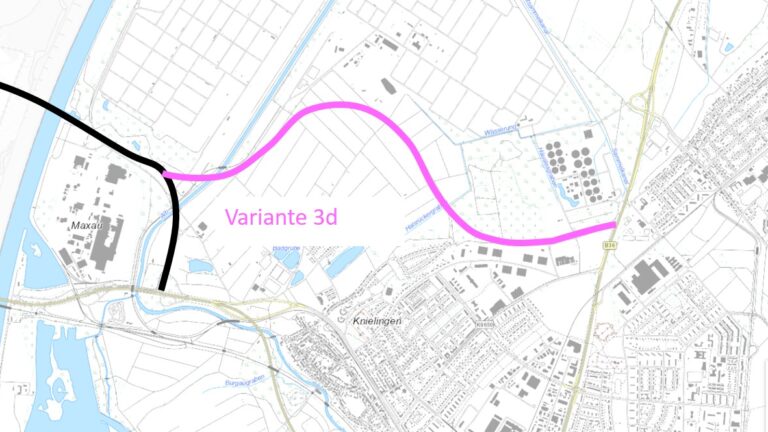 Das Regierungspräsidium Karlsruhe plant im Zuge des Vorhabens "Zweite Rheinbrücke Karlsruhe-Wörth" die Fortführung einer Verkehrsverbindung bis zur B36. Ziel dieser "Querspange" sei die Entlastung der Ortsdurchfahrten von Mühlburg und Knielingen.