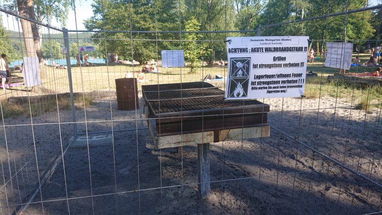 Der Landkreis Karlsruhe erlässt, wegen erhöhter Waldbrandgefahr, eine Allgemeinverfügung zur Sperrung der Grill- und Feuerstellen. Die Benutzung von Grill- und Feuerstellen in den Karlsruher Wäldern, einschließlich mitgebrachter Grills, ist untersagt.