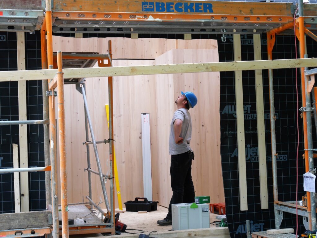 Der Rohbau des mit dem ersten Preis prämierten Hauses wurde gemeinsam mit Zimmerei-Meisterschülern der Friedrich-Weinbrenner-Gewerbeschule Freiburg im Rahmen einer Seminarwoche im Sommer 2021 als sortenrein konstruiertes Design-Build-Projekt 1:1 auf dem Campingplatz Durlach realisiert.