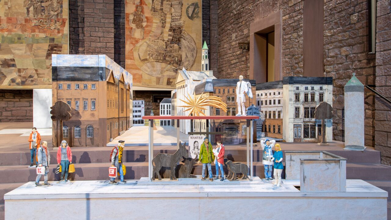 Die Heilige Familie, geflüchtet und angekommen in der Fächerstadt, eine Krankenschwester, ein Obdachloser, ein KSC-Fan und andere Passanten treffen an einer Straßenbahnhaltestelle aufeinander und thematisieren die unterschiedlichen Bereiche der Stadtgesellschaft.