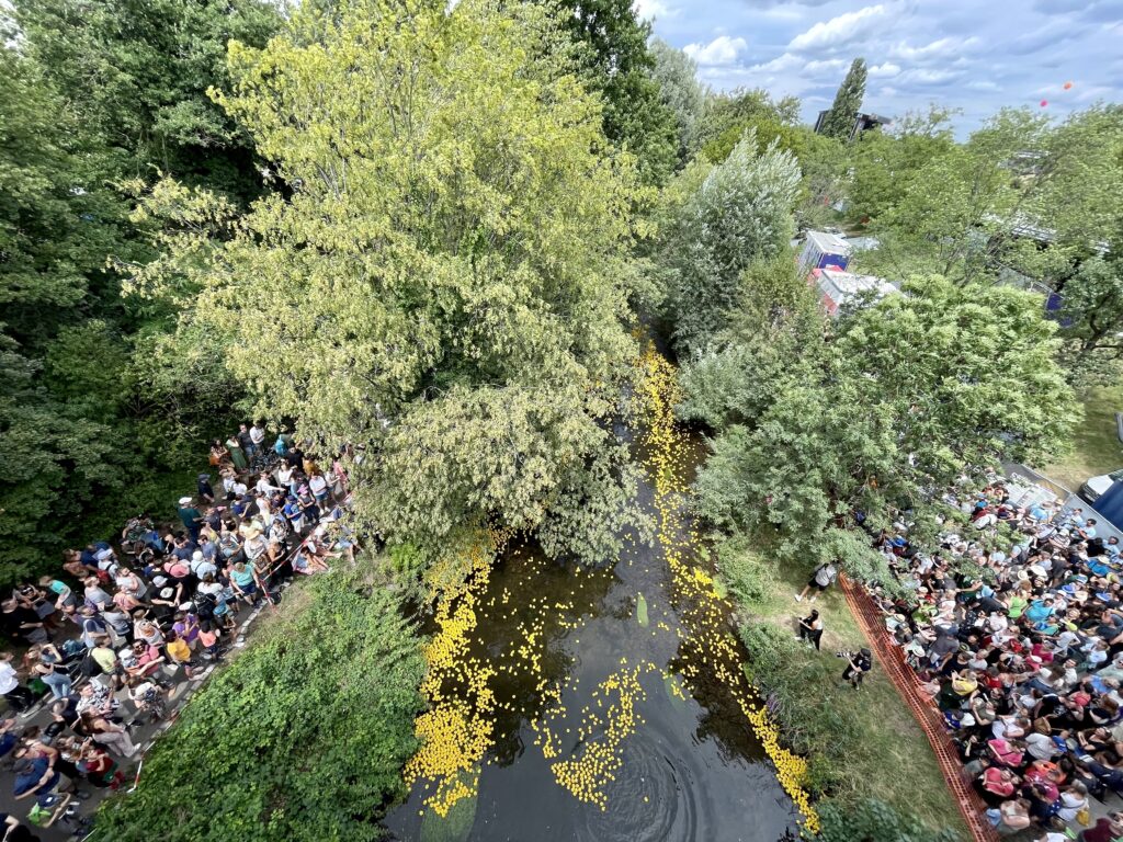 Das Entenrennen hat bereits seit 2007 eine Tradition in Karlsruhe. Immer am DAS FEST-Sonntag werden die gelben Gummi-Enten auf der Alb in der Günther-Klotz-Anlage ins Wasser gelassen.